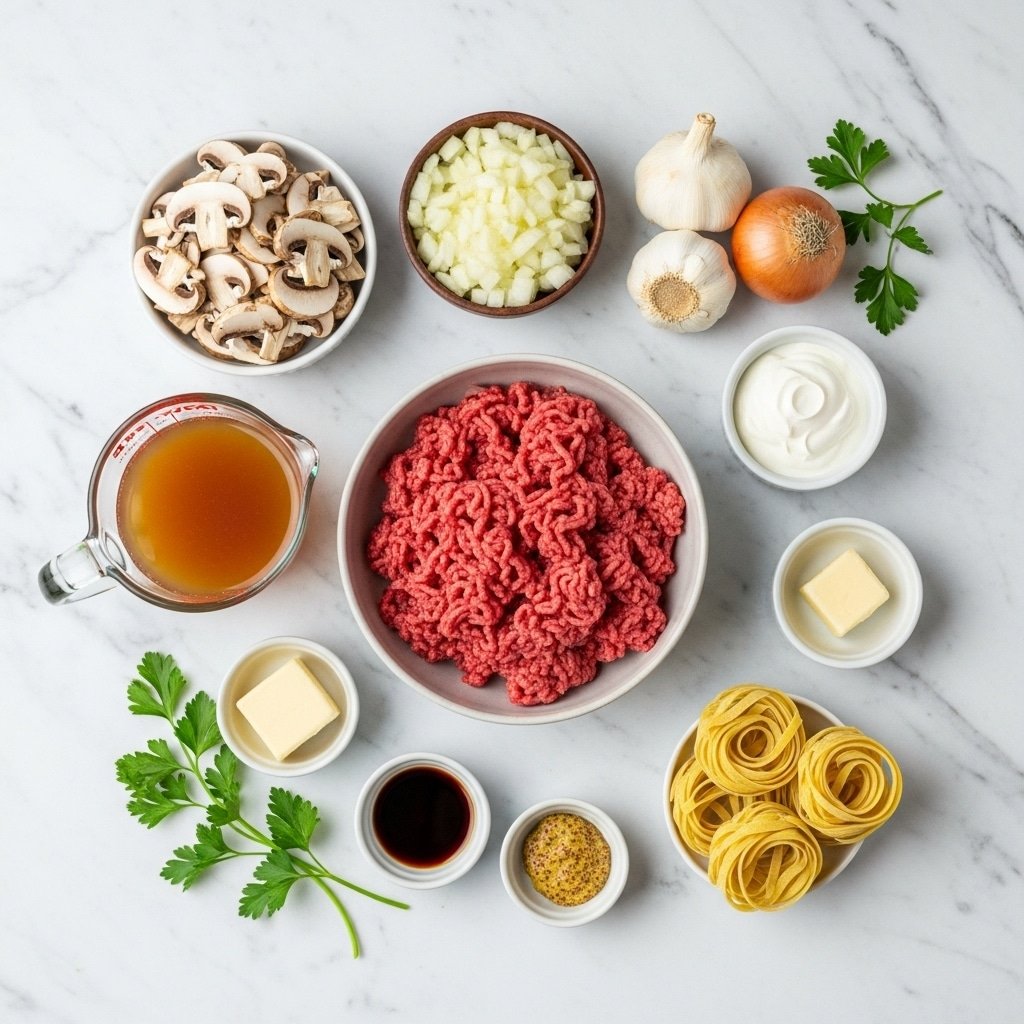 - 1 pound Ground Beef: I recommend an 80/20 blend (ground chuck). The 20% fat content is necessary to carry the earthy flavors of the mushrooms and to create a silkier roux.