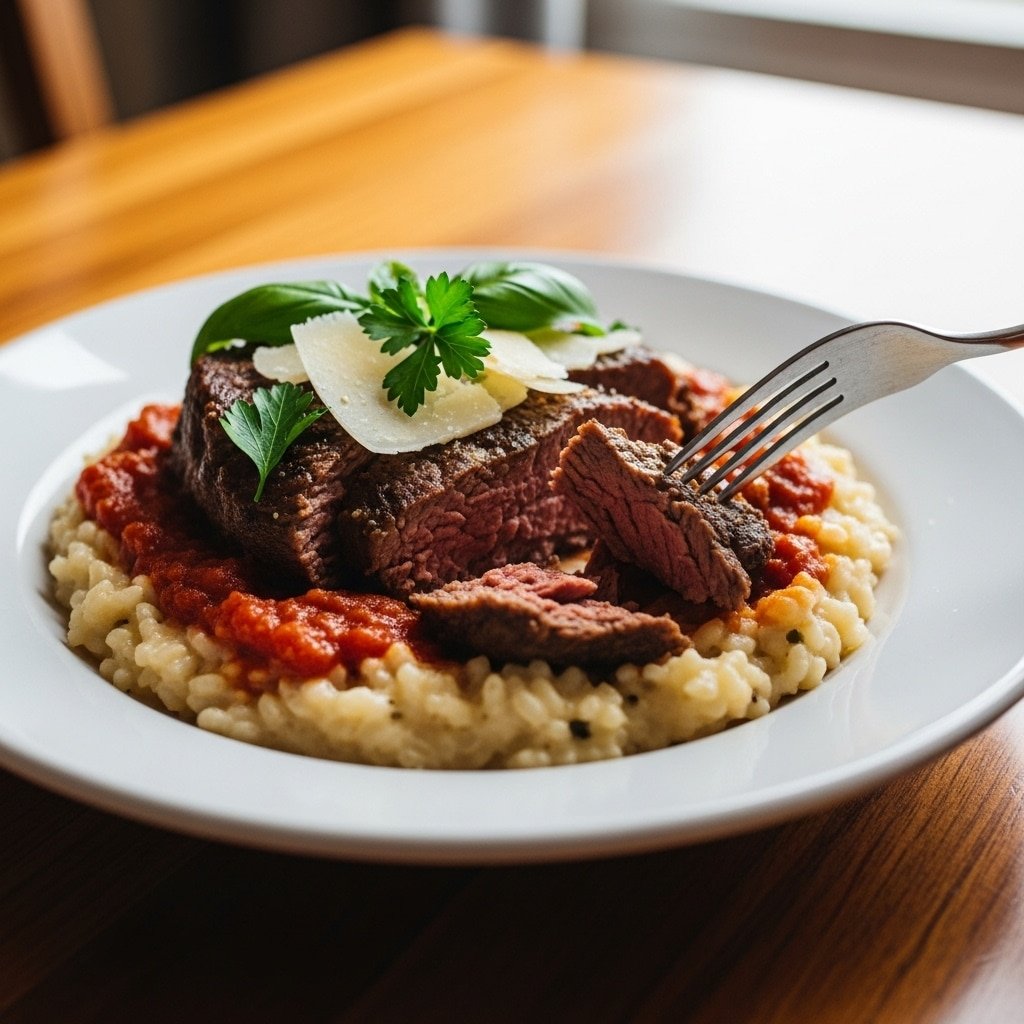 Step 6: Serve Remove pot roast from oven. The meat should be fall-apart tender. Slice or shred the beef. Spoon creamy risotto onto plates, top with pot roast, and ladle the rich tomato sauce over everything. Garnish with fresh herbs and extra Parmesan if desired.