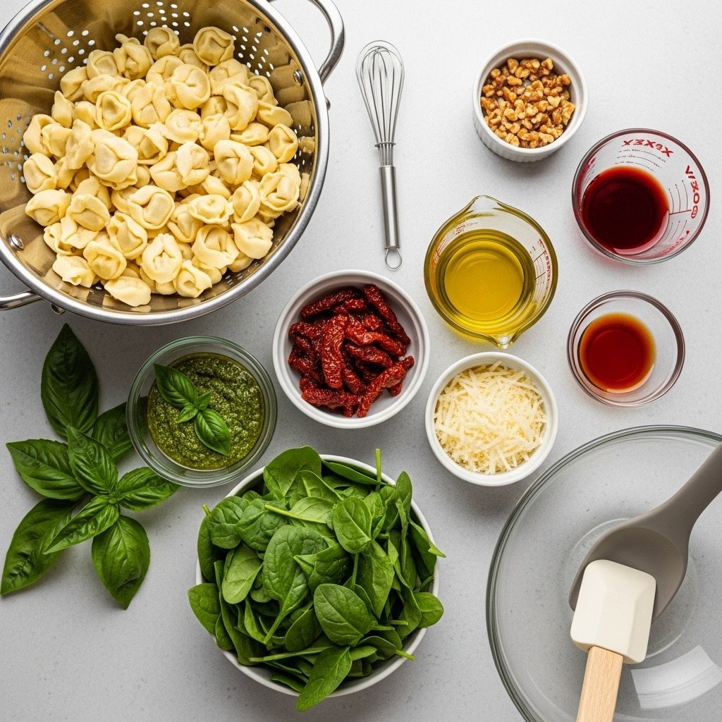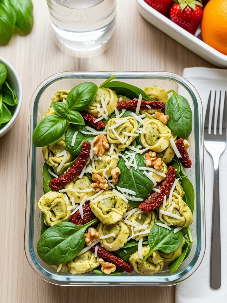 Cold tortellini is absolutely key — rinse them with cold water, let them cool completely. Don’t skip the acid (vinegar or lemon juice), it makes everything taste bright instead of heavy. Sun-dried tomatoes in oil are easier than dried ones. Mix gently so tortellini doesn’t break apart. This is actually better made the night before — flavors get deeper, everything softens a little. If you’re meal prepping and packing for school, keep fresh spinach separate and add the day you eat it so it stays fresher. If using nuts, toast them in a dry skillet for two minutes. This keeps in the fridge for up to five days and travels perfectly in a container — no reheating needed, just grab and go.